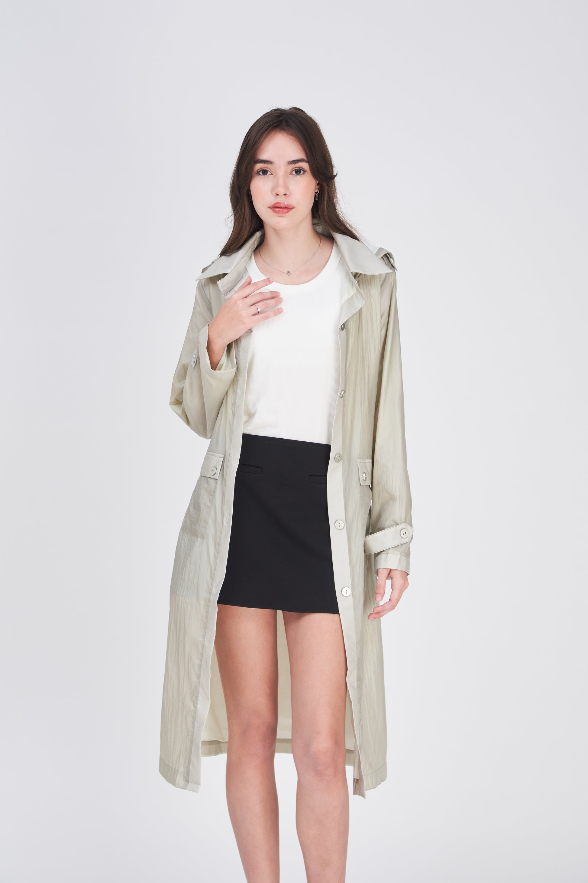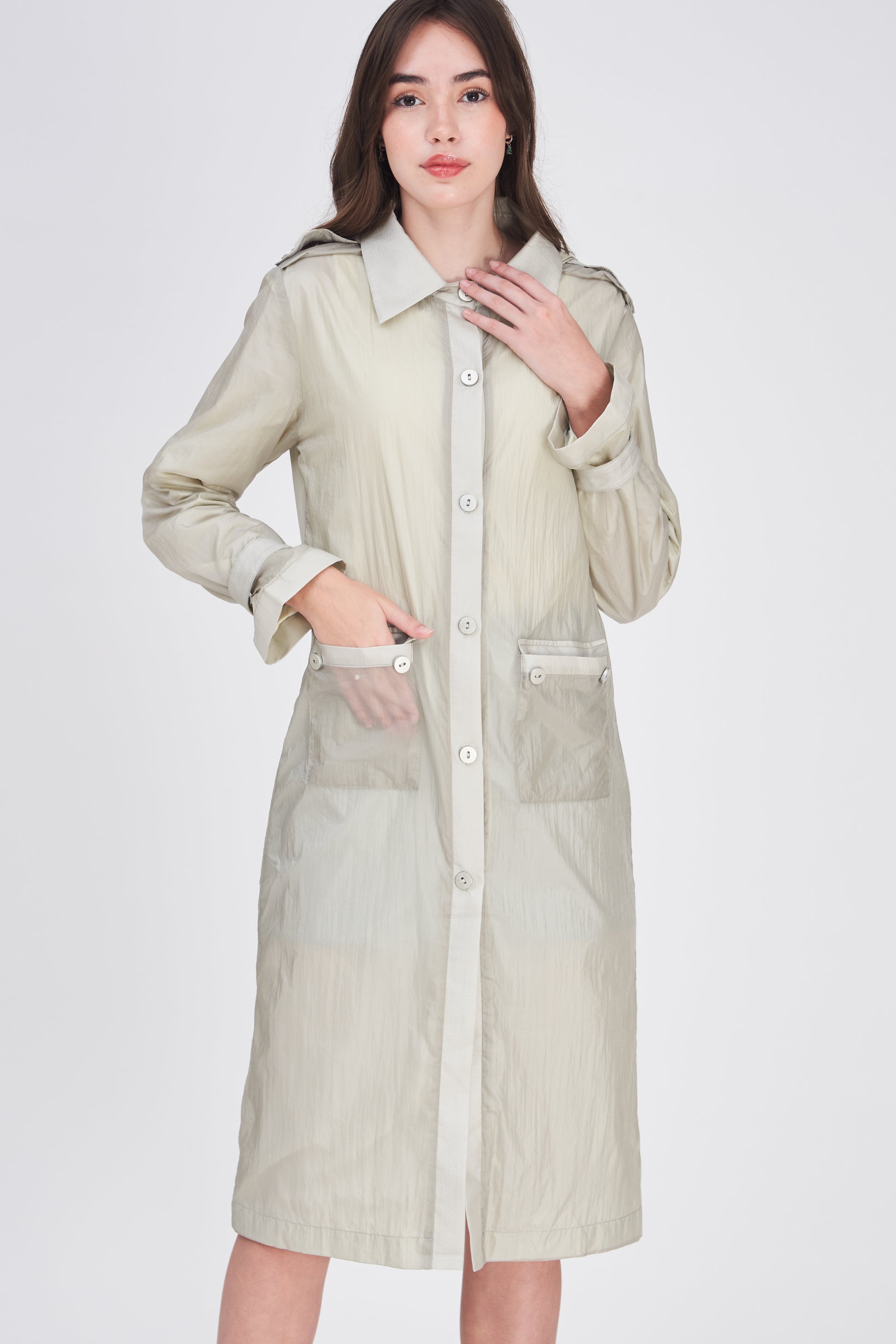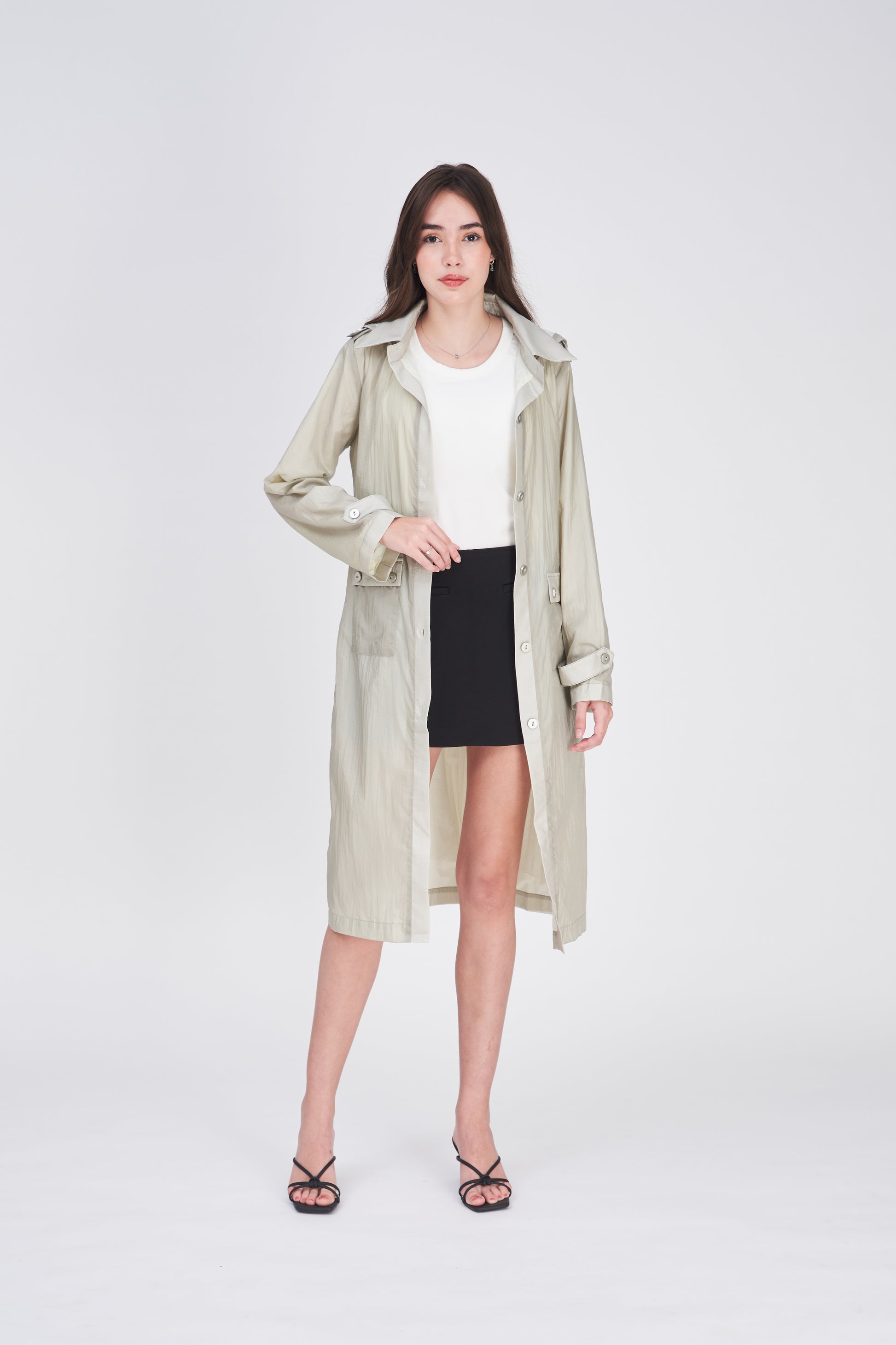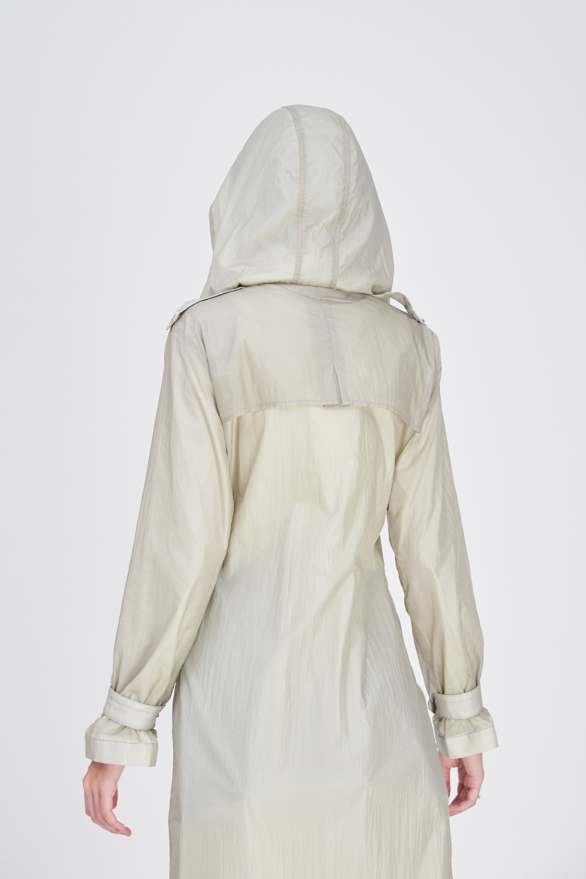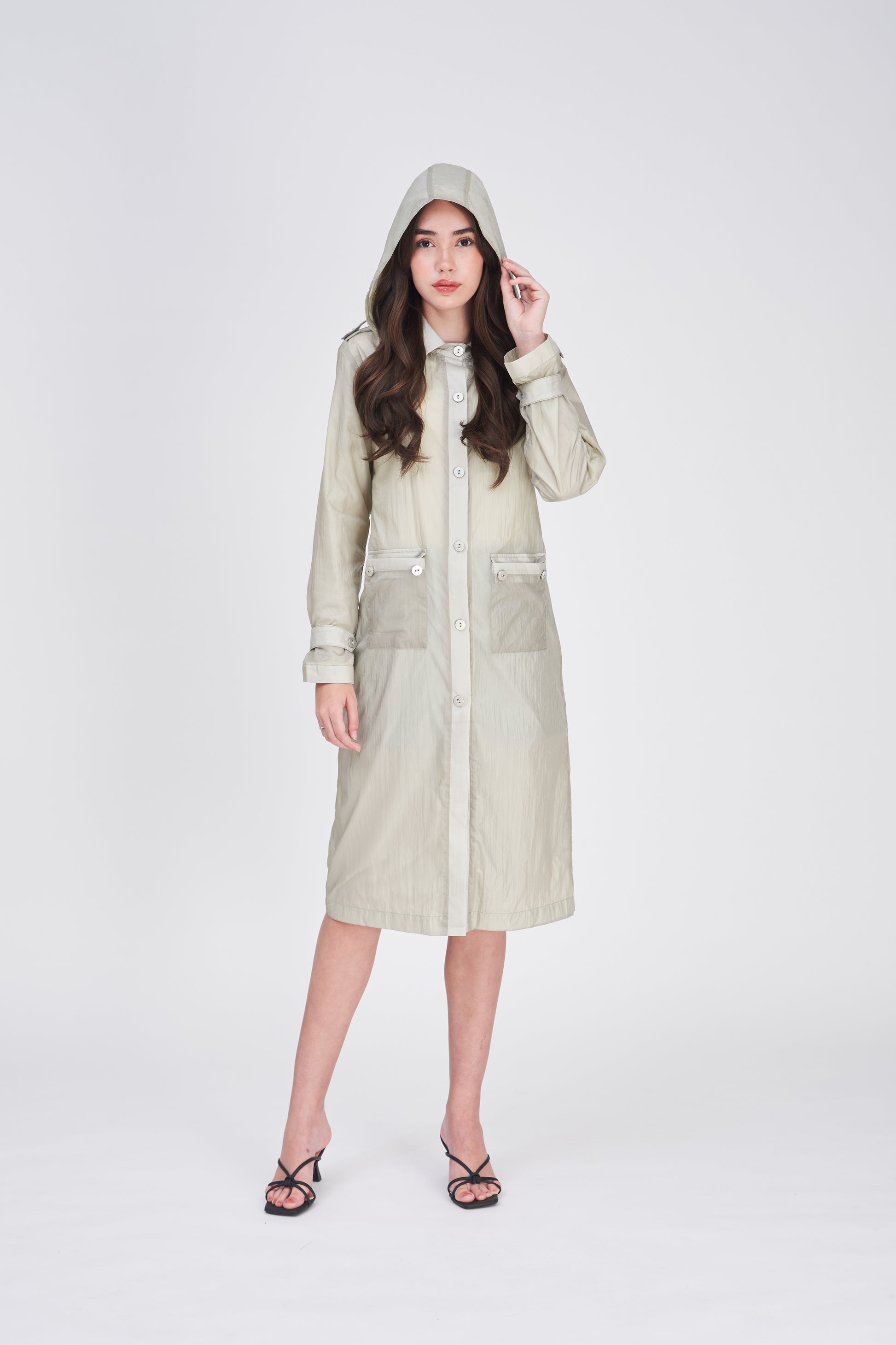Full-length lightweight spray jacket with hood ideal for the commute to the office or formal occasions classy, professional, versatile.