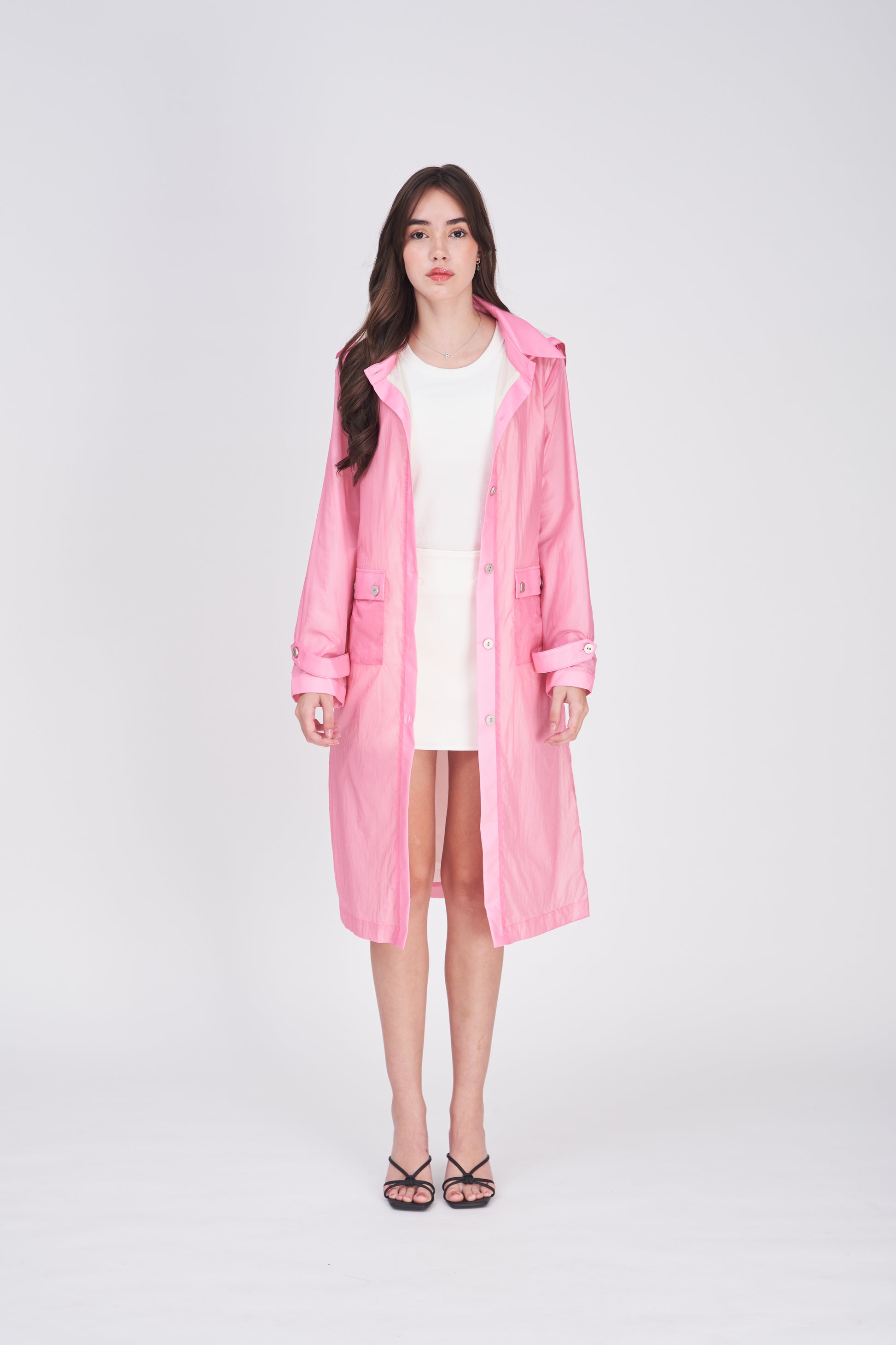 Full-length lightweight spray jacket with hood ideal for the commute to the office or formal occasions classy, professional, versatile.